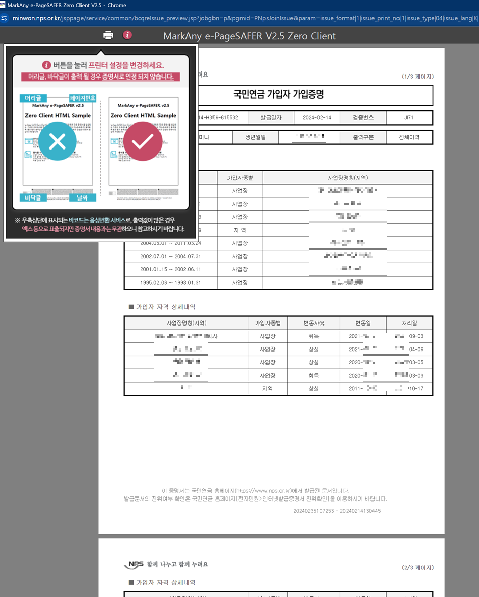 (2) 가입증명서가 조회되면 -->[프린터발급] 선택 클릭