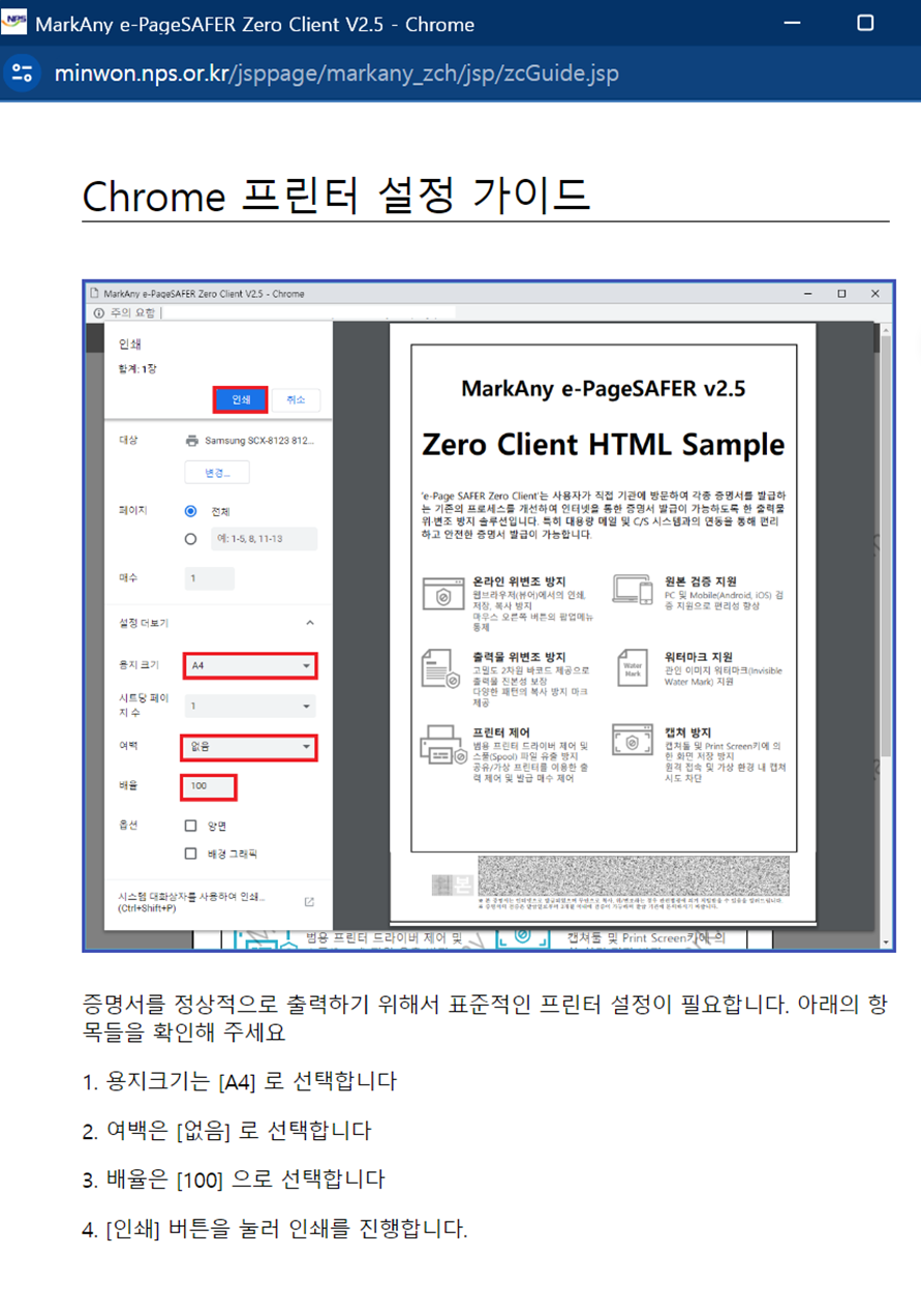 (3) 증명서로 쓰기 위한 인쇄 설정하기 = [ A4용지설정, 여백 없이, 배율은 100%로 ]